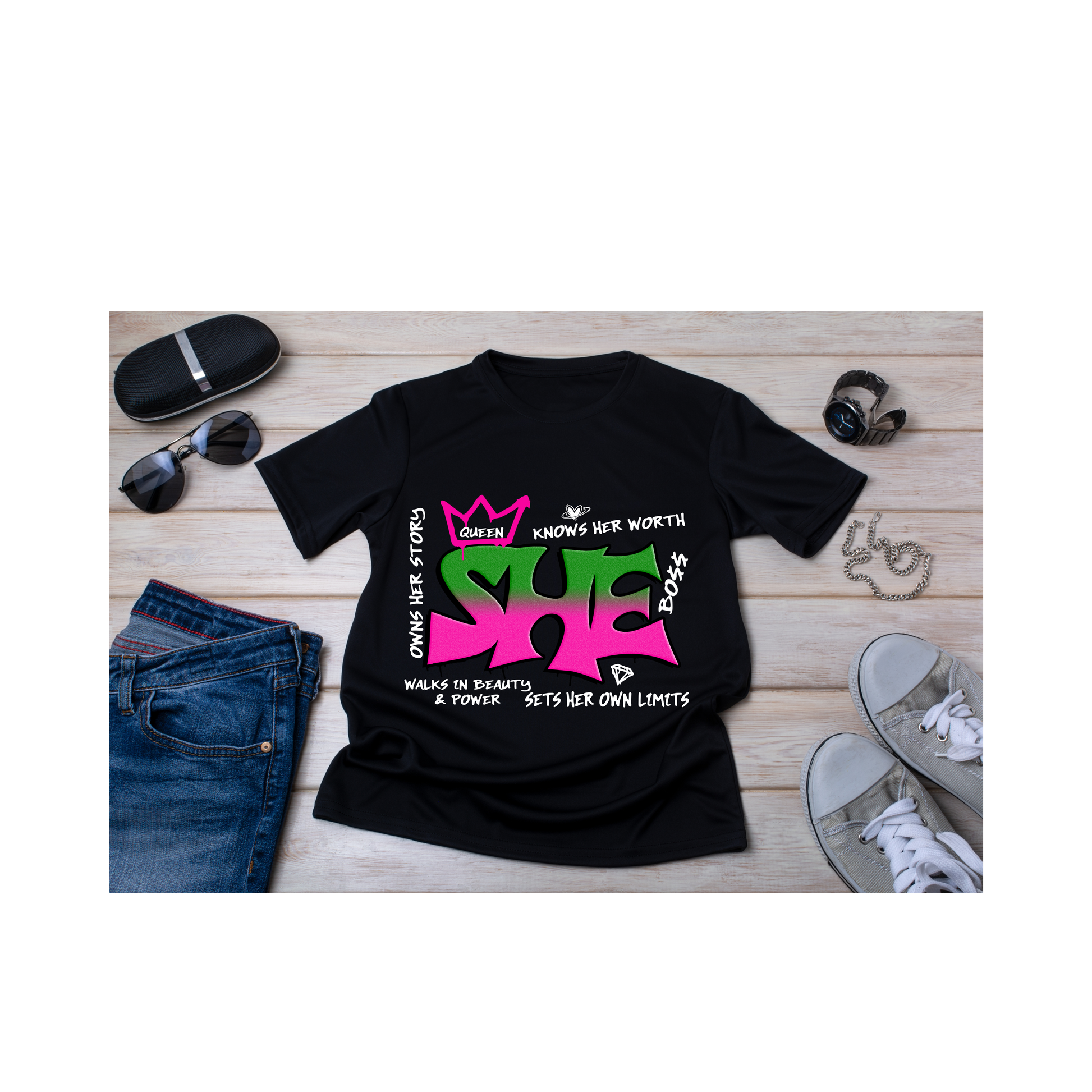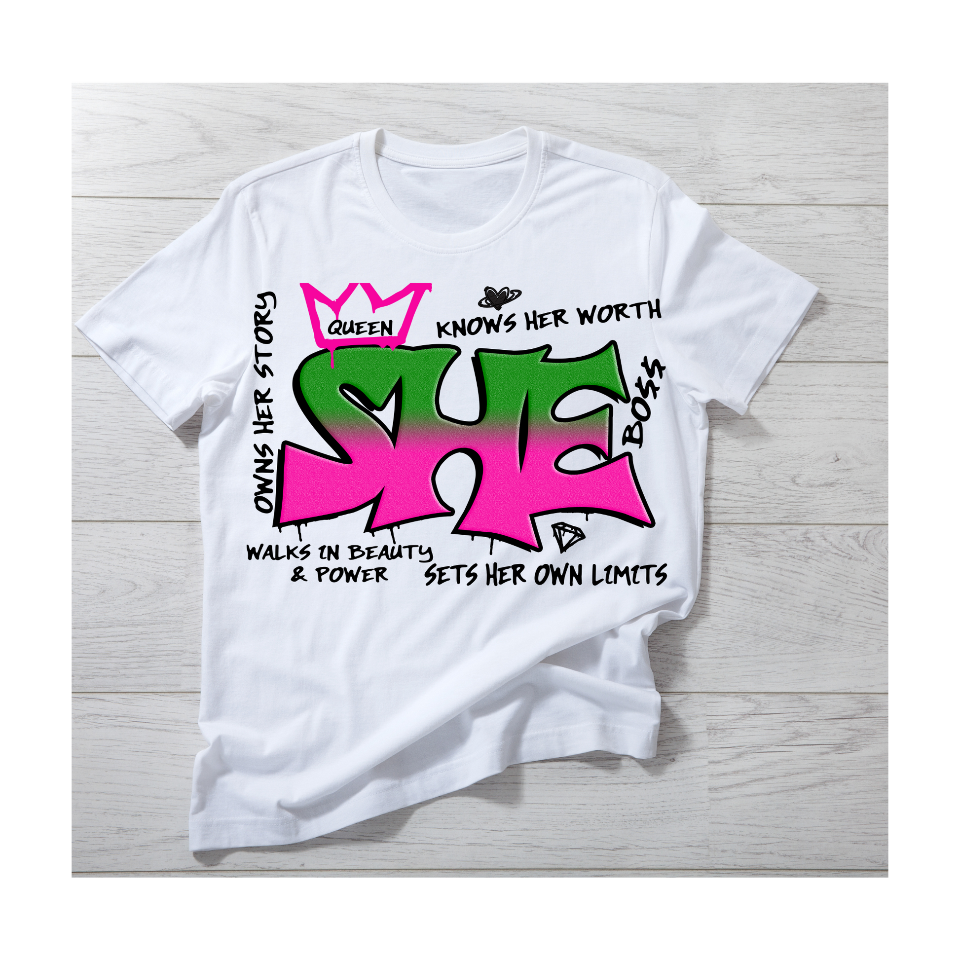 Introducing the "SHE" Tee Shirt - a quality unisex t-shirt designed to make you feel confident, comfortable, and blessed. Made with premium materials and a classic design, this tee shirt is perfect for everyday wear or special occasions. Show off your style with the "SHE" Tee Shirt.